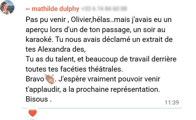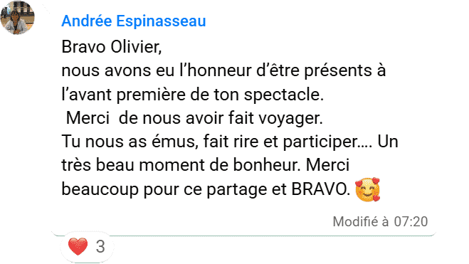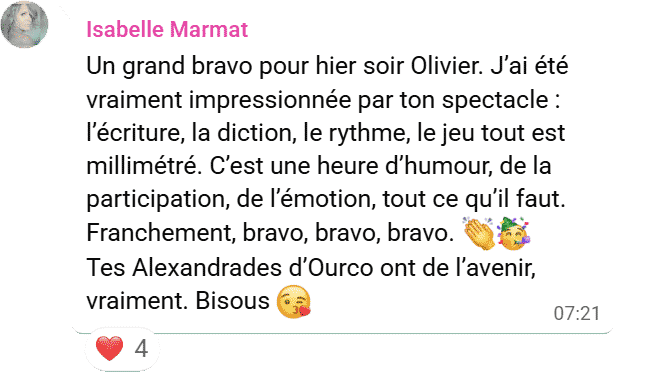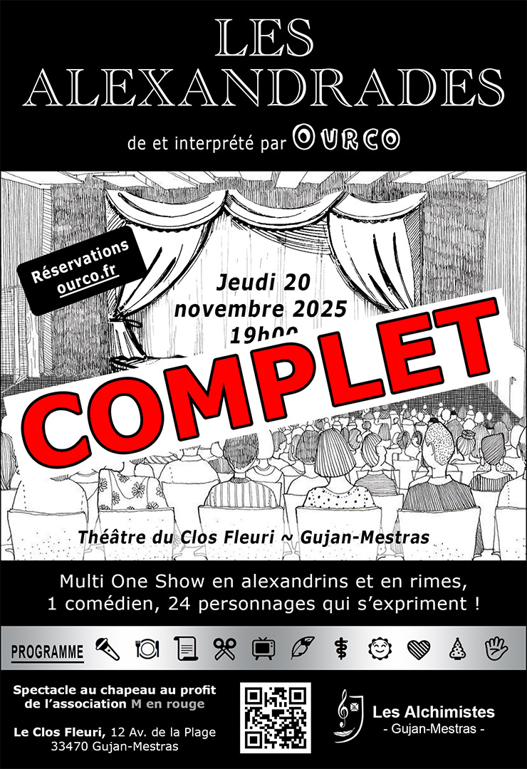 LES ALEXANDRADES 20 Novembre 2025Gujan Mestras Théâtre du Clos FleuriEntrées : 54 – Guichet fermé Association Les AlchimistesGujan-Mestras Spectacle au chapeau au profit de l’association M en Rouge. Somme récoltée : 400 €